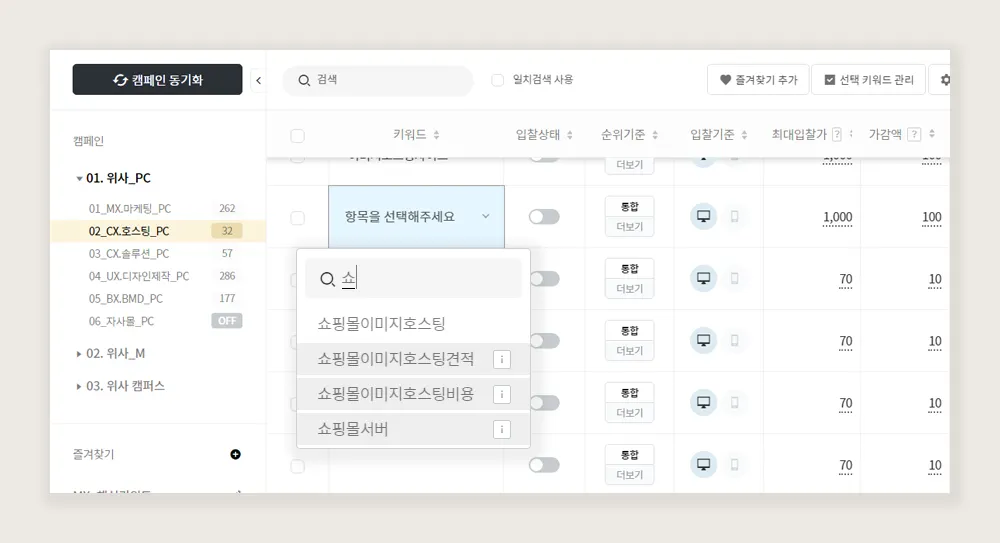 4. 원하는 키워드를 입력하면 해당 키워드를 포함한 키워드가 목록에 나타납니다. 키워드 목록에서 입찰에 사용할 키워드를 클릭해 선택합니다.