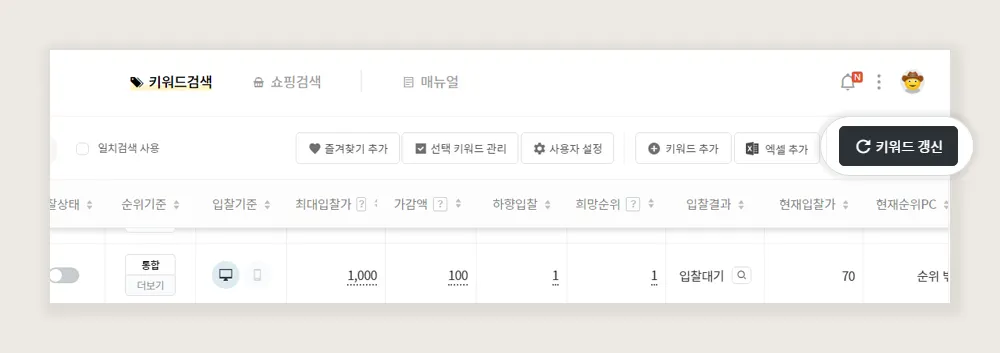 6. 키워드 갱신 을 클릭하여 키워드의 현재 정보를 최신 정보로 동기화 합니다.
