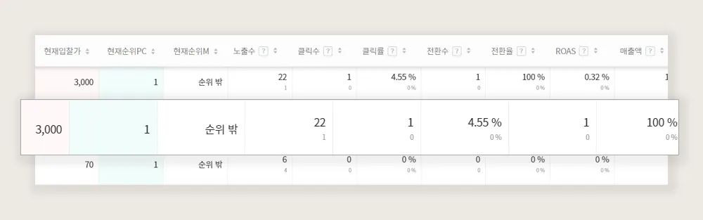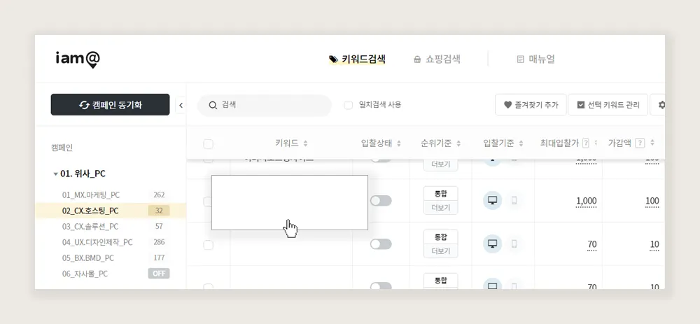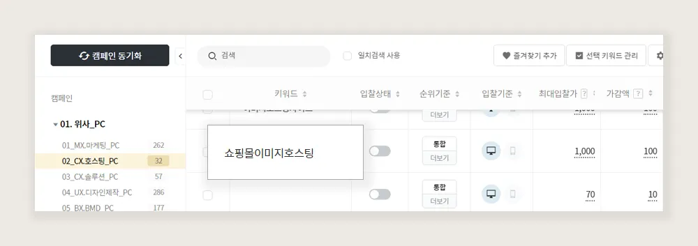 3. 왼쪽 캠페인 메뉴에서 입찰을 진행할 키워드가 포함된 그룹을 선택한 후 키워드 항목의 빈칸을 더블 클릭합니다.
