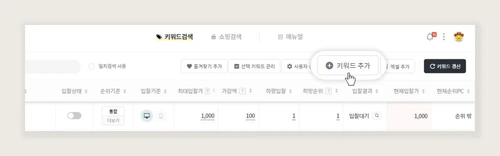 입찰에 사용할 키워드를 등록합니다.
