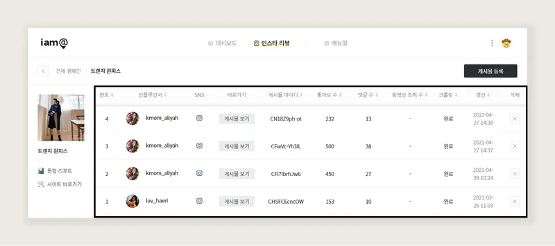 게시물 등록이 완료되면 인스타 리뷰 페이지 내 각 캠페인 별로 등록한 게시물이 표시됩니다.