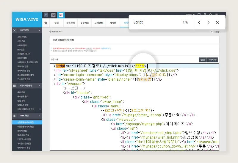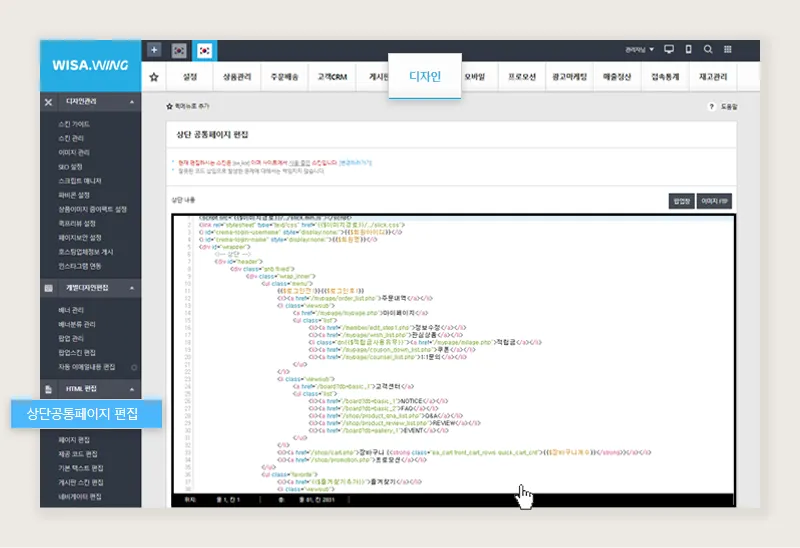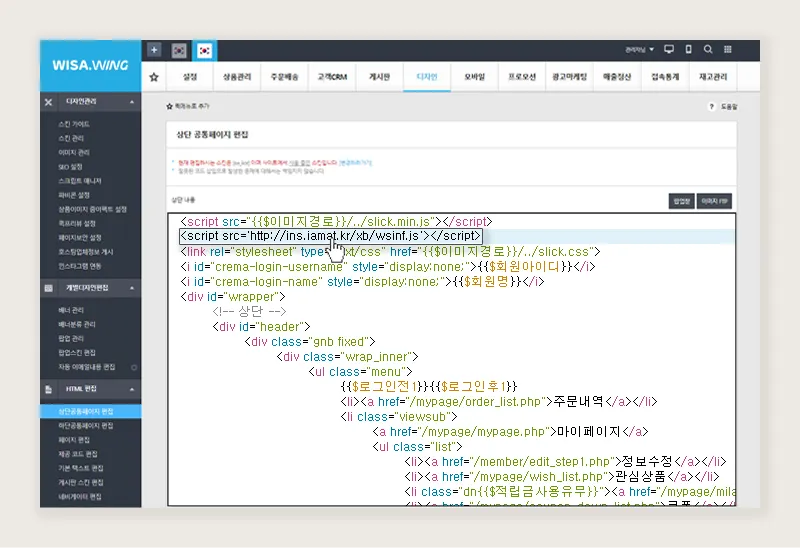위사윙→디자인→HTML 편집→상단 공통 페이지 편집→HTML 입력 영역