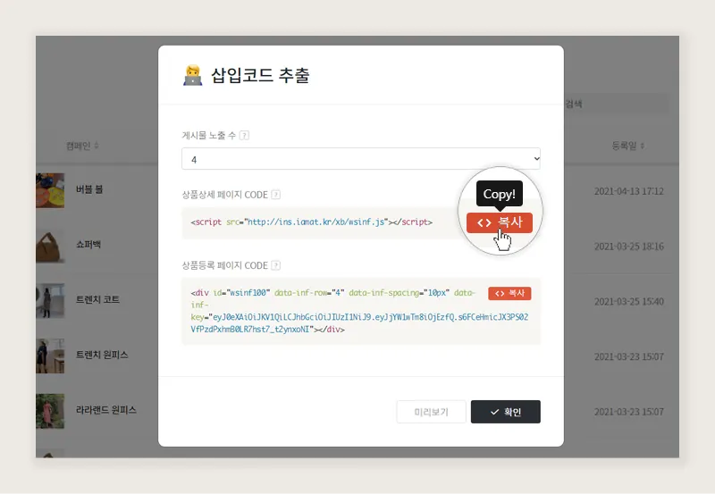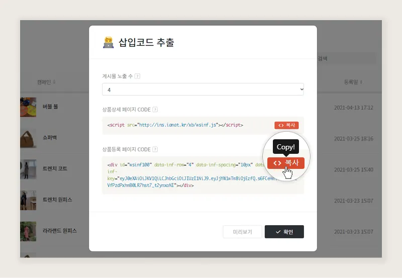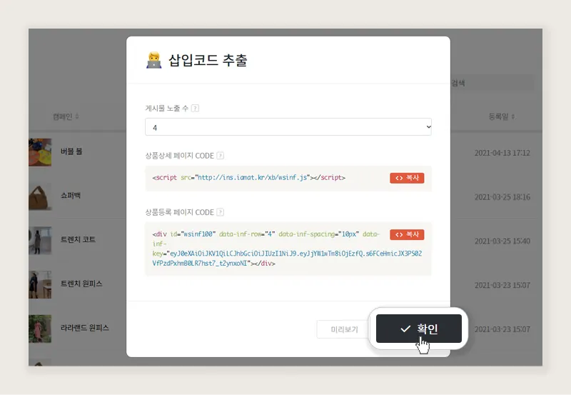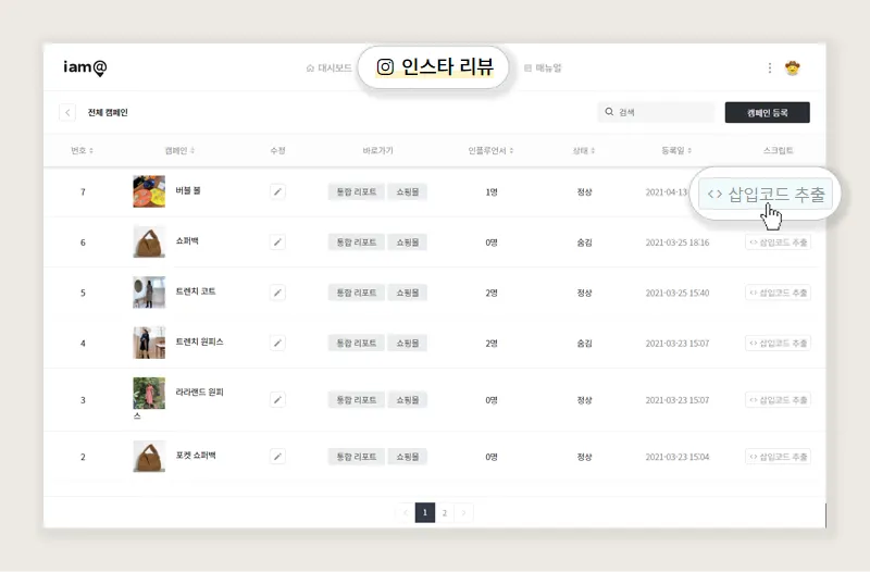 연동 작업을 위해 인스타 리뷰 > 삽입 코드 추출 버튼을 클릭합니다.