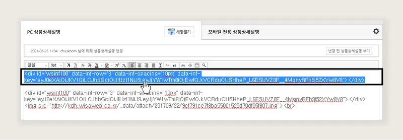 8. 새로 생긴 줄에 복사한 상품 상세 페이지 CODE를 붙여 넣어줍니다.