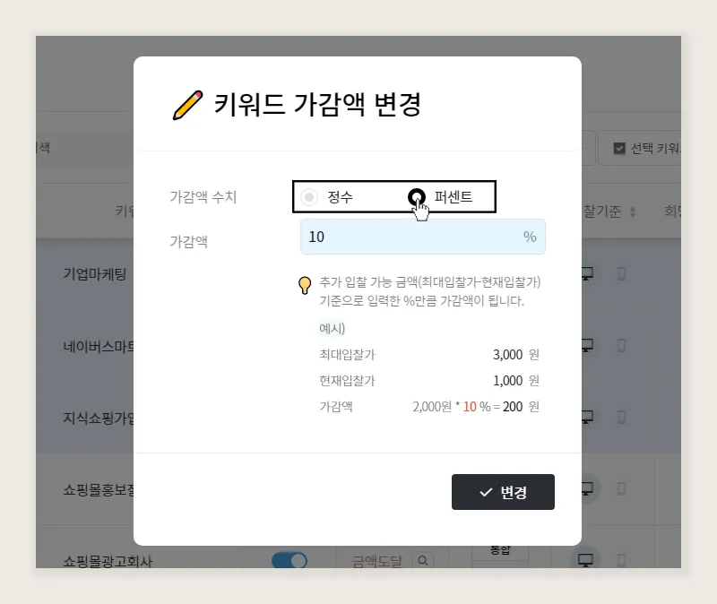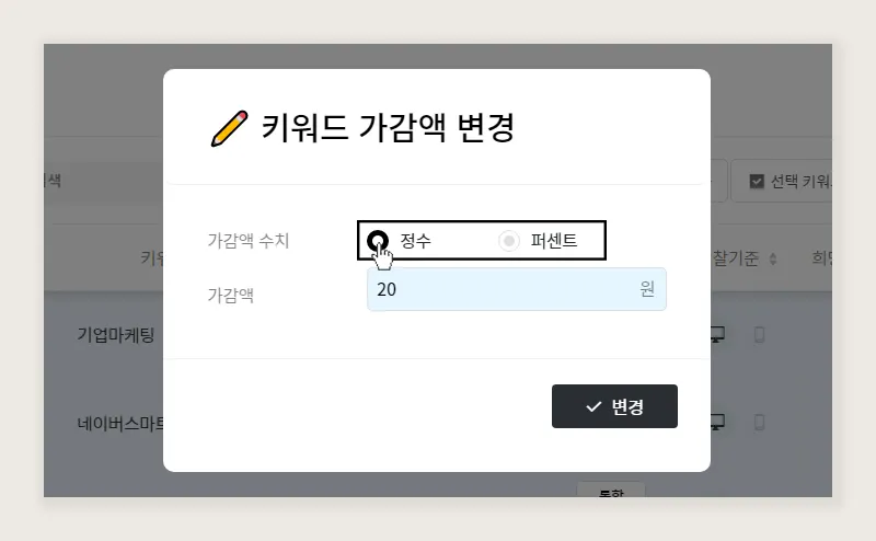 정수: 일괄적으로 입력한 숫자로 가감액이 변경됩니다. 예를 들어 20을 입력하면 선택한 키워드의 모든 가감액이 20원으로 변경됩니다. 가감액은 10원 단위로 입력 가능합니다.