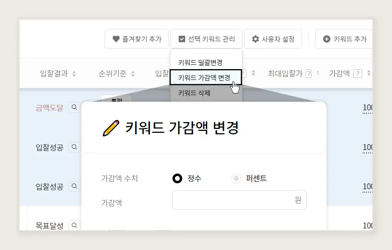 선택한 키워드들의 가감액을 금액과 비율(%)로 일괄 변경합니다.
