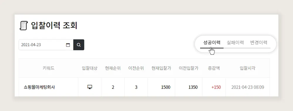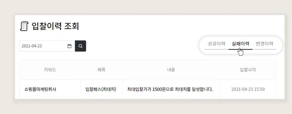 이력 조회 대상 키워드가 입찰에 실패한 이력을 확인할 수 있습니다.