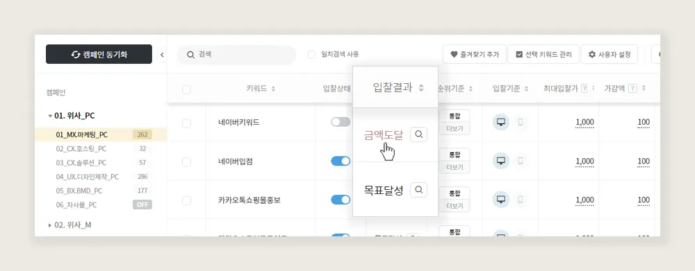 금액 도달 : 최고 입찰가에 도달한 키워드 수 입니다.