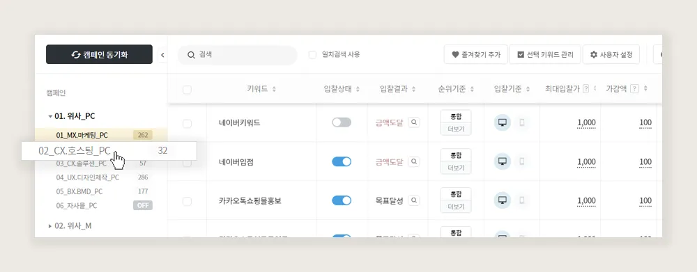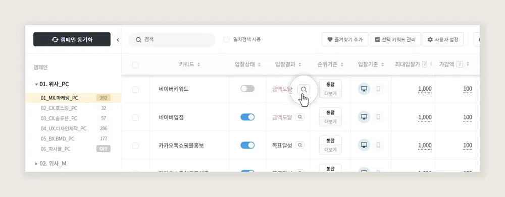 (사용 불가로 입찰이 패스된 경우, 아래 그림과 같이 캠페인, 광고그룹, 키워드