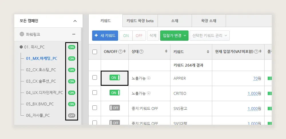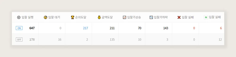 입찰 실행 : 입찰이 실행되었던 키워드 수 입니다. (현재 활성화 여부에 따라 ON/OFF로 구분)