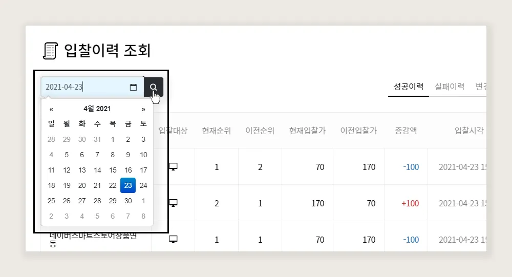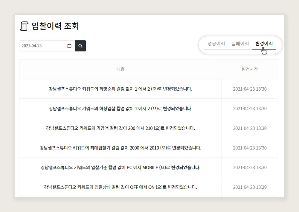 (변경 이력 조회 가능 칼럼 : 희망순위, 하향입찰, 최대입찰가, 가감액, 입찰기준, 입찰상태)