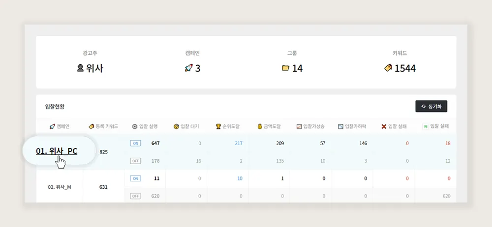 아엠앳 키워드 입찰 솔루션 메인 대시보드 화면에서 현재의 입찰 현황을 요약해서 확인 할 수 있습니다.